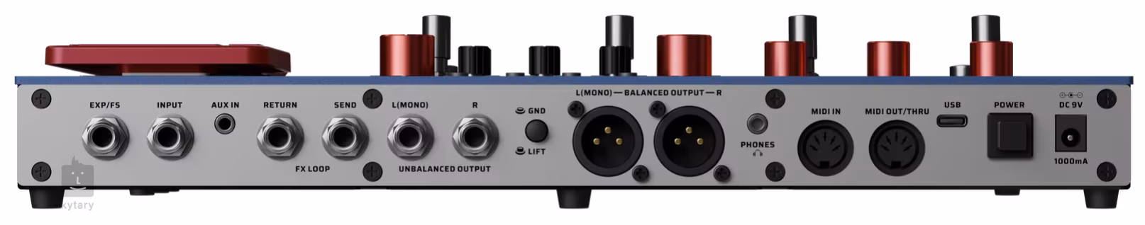 Im Vergleich zum GP-100 bietet dieser Multieffekt eine breitere Palette an Signal-Routing-Optionen. Auf der Rückseite befinden sich ein Mono-Eingang und ein Mono-/Stereo-Klinkenausgang, zwei symmetrische XLR-Ausgänge, eine Effektschleife, MIDI I/O, eine Win/Mac/iOS/Android-kompatible USB Type-C-Schnittstelle für Audio-Streaming oder die Anbindung an einen Win/Mac-Editor, ein Eingang für ein externes Expression-Pedal/Switcher und ein Kopfhörerausgang, der traditionell von einem Aux-In-Eingang für externe Audioquellen begleitet wird. Die gesamte Elektronik ist in einem robusten Metallgehäuse untergebracht. Die Stromversorgung des Multieffekts erfolgt über einen 9V-Adapter.