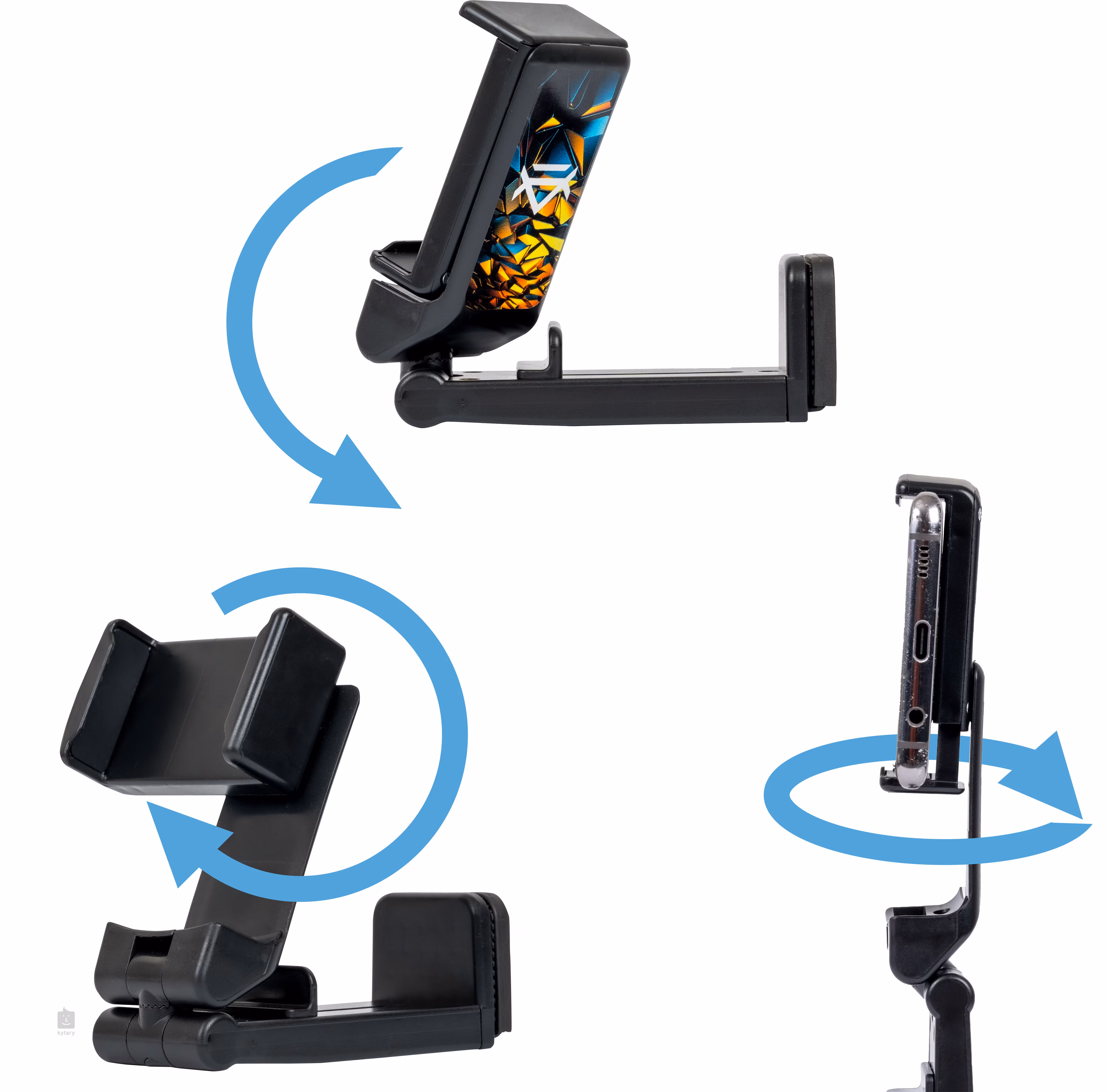 Der Smartphone-Halter von Veles-X wird Ihnen zu Hause und unterwegs dienen. Er ist kompakt, leicht zu transportieren und bietet eine breite Palette von Anwendungsmöglichkeiten. Sie können ihn an einem Schreibtisch, einem Flugzeugsitz, einem Gerät im Fitnessstudio, an der Seite eines Regals und vielem mehr befestigen. Die Klemme lässt sich bis zu 38 mm öffnen, und ihre gummierte Oberfläche schützt Oberflächen vor Kratzern. Die Halterung ist um 360° drehbar und verfügt über ein Doppelgelenk, mit dem sich das Telefon in alle Winkel einstellen lässt. Sie ist mit Smartphones mit einer Größe von 4 bis 6,5 Zoll kompatibel. Sie ist mit Aufklebern in stilvollem Graphit und dem Veles-X-Logo verziert.