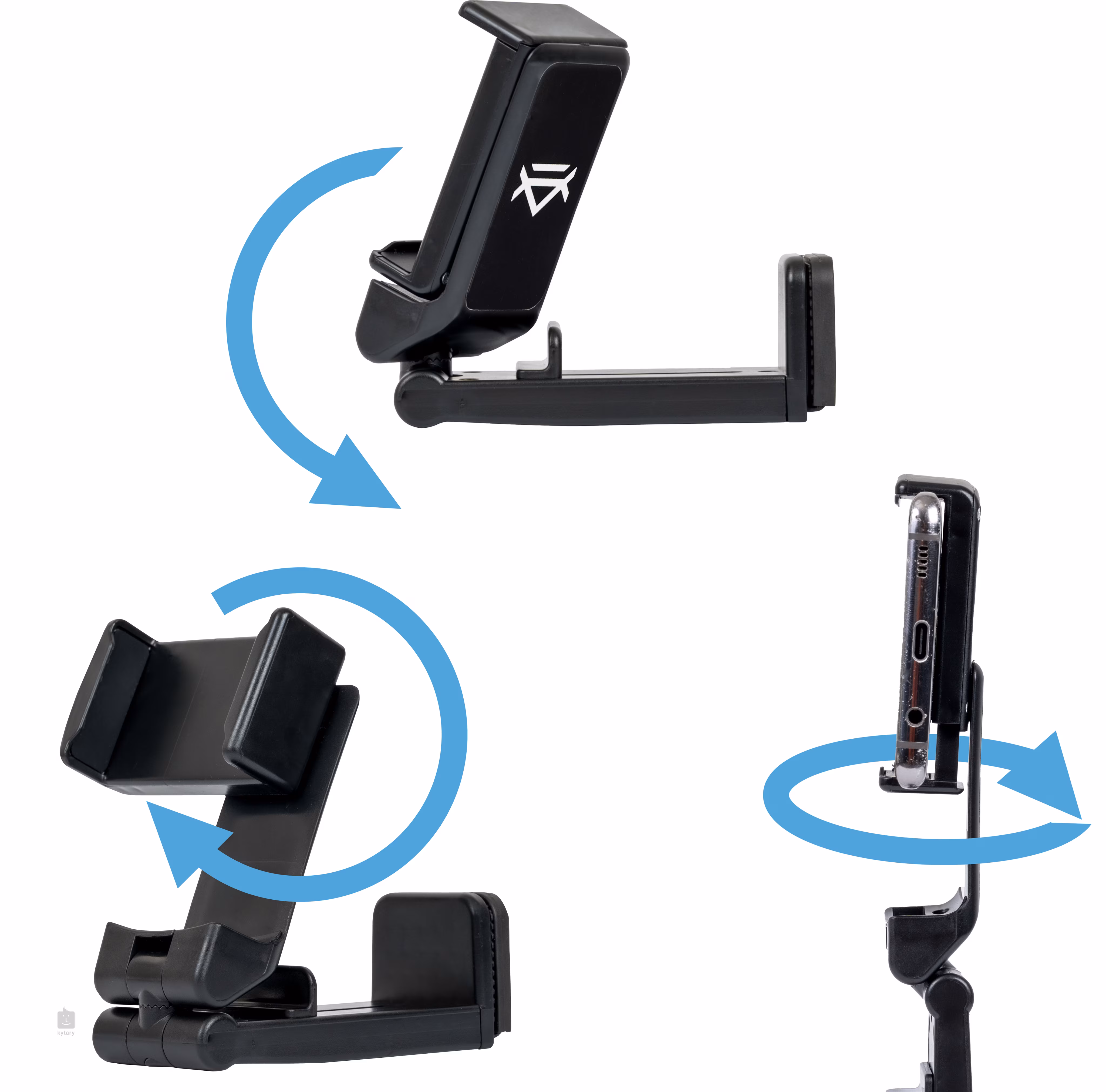 Der Smartphone-Halter von Veles-X wird Ihnen zu Hause und unterwegs dienen. Er ist kompakt, leicht zu transportieren und bietet eine breite Palette von Anwendungsmöglichkeiten. Sie können ihn an einem Schreibtisch, einem Flugzeugsitz, einem Gerät im Fitnessstudio, an der Seite eines Regals und vielem mehr befestigen. Die Klemme lässt sich bis zu 38 mm öffnen, und ihre gummierte Oberfläche schützt Oberflächen vor Kratzern. Die Halterung ist um 360° drehbar und verfügt über ein Doppelgelenk, mit dem sich das Telefon in alle Winkel einstellen lässt. Sie ist mit Smartphones mit einer Größe von 4 bis 6,5 Zoll kompatibel. Sie ist mit schwarzen Aufklebern mit dem Veles-X-Logo verziert.