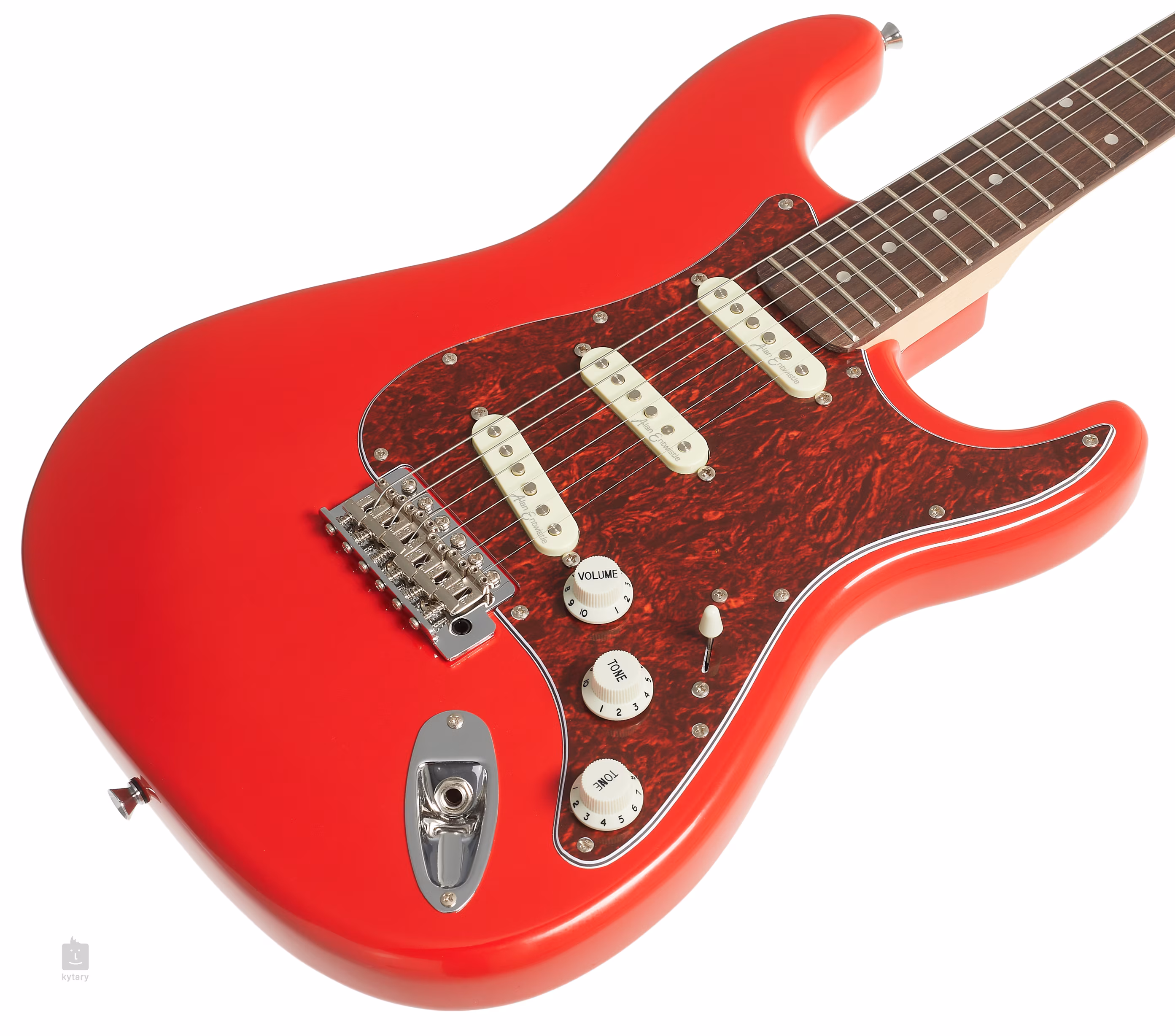 Die Saiten sind durch verchromte Druckgussmechaniken und Vibrato mit verstellbaren Sätteln verankert. Das Styling wird durch traditionelle Elemente in Form eines dreilagigen Pickguards und Positionspunkten auf dem Griffbrett akzentuiert.