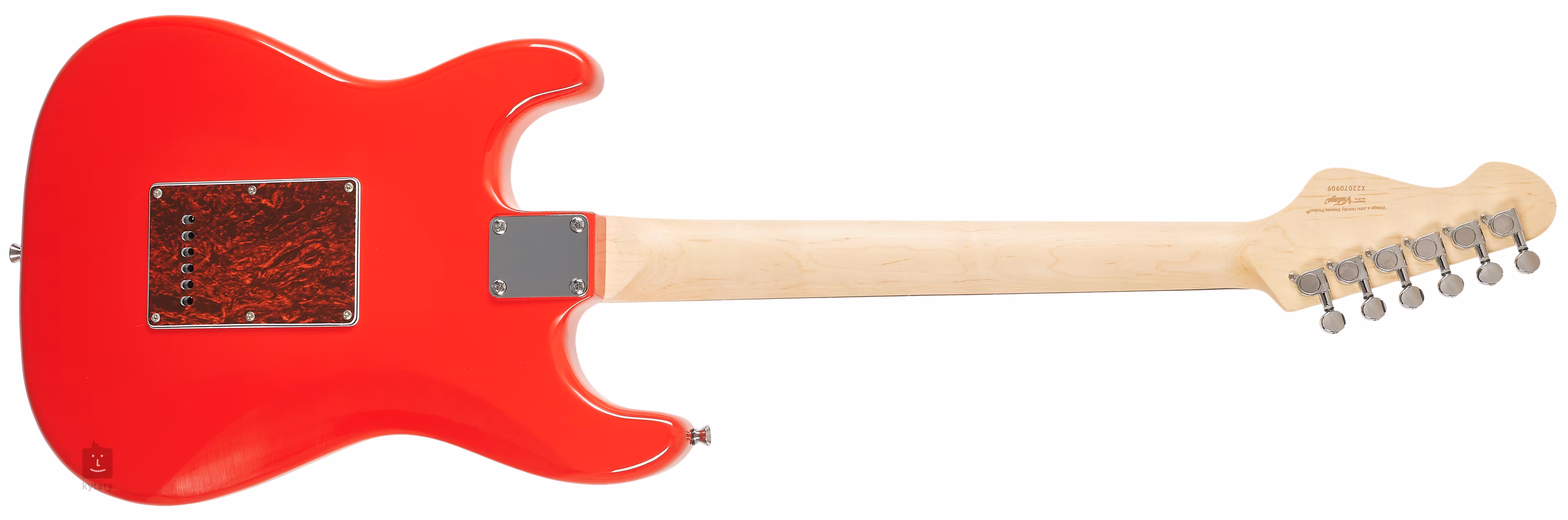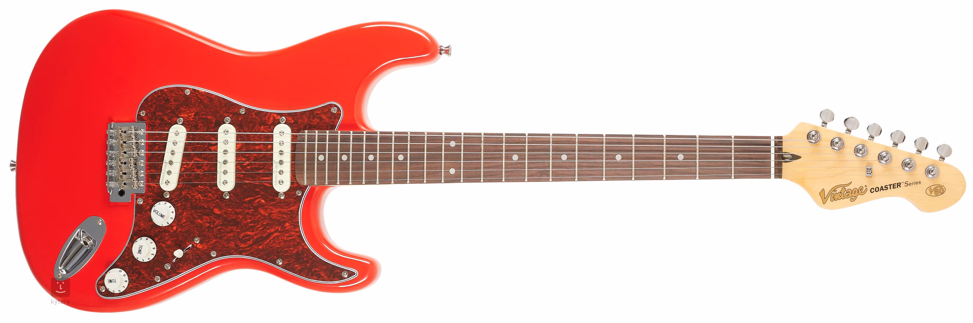 Die Vintage V60 Coaster Series Gloss Red ist eine E-Gitarre in der Double-Cut-Form der ST-Modelle. Der Korpus des Instruments ist aus dem Holz des asiatischen Pavlovnia-Baumes gefertigt. Ein Palisander-Griffbrett mit zweiundzwanzig Bünden ist auf den verschraubten Ahornhals geklebt.