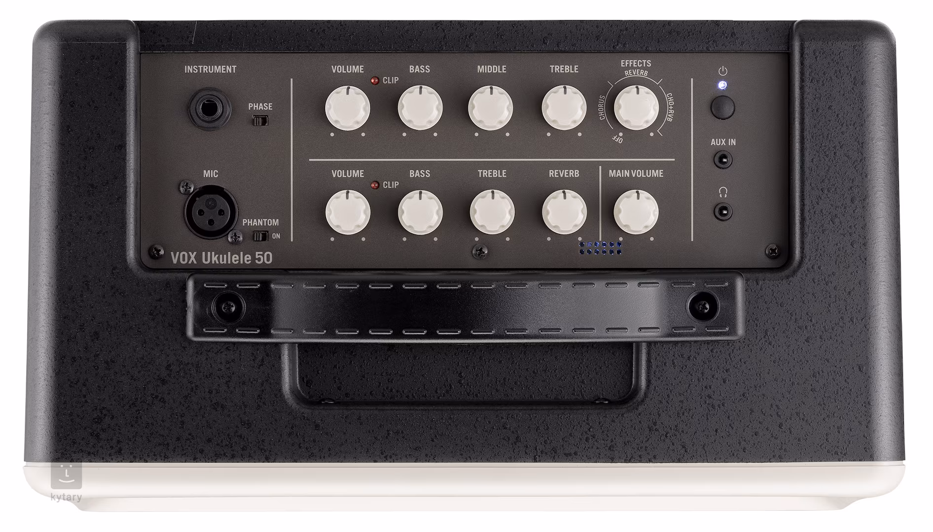 Der Vox Ukulele 50 ist ein leichter Zweikanal-Ukulele-Combo mit NuTube-Vakuumröhre und 50 Watt Leistung, der das Problem der Beschallung der wachsenden Zahl von Songwritern und Sängern, die sich selbst auf der Ukulele begleiten, zuverlässig lösen wird. Ein Mikrofon-XLR-Eingang mit schaltbarer Phantomspeisung und ein Instrumenteneingang werden ergänzt durch Bedienelemente in Form von Zwei- und Dreiband-EQ, Reverb-Effekten auf dem Mikrofonkanal und Reverb-, Chorus- und Reverb+Chorus-Effekten auf dem Instrumentenkanal sowie praktische Features in Form eines Aux-In-Eingangs zum Abspielen von Backing-Tracks von externen Multimedia-Geräten, eines Kopfhörerausgangs und eines Line-Ausgangs.
