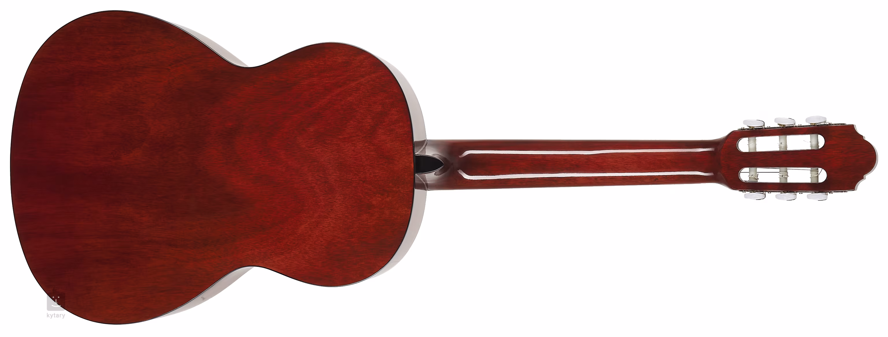 Die Saiten sind in einem Palisandergriffbrett und klassischen offenen Stimmmechaniken verankert. Das Erscheinungsbild der Gitarre wird durch dekorative Akzente in Form von schwarzem Binding und Zierrosetten aufgewertet.