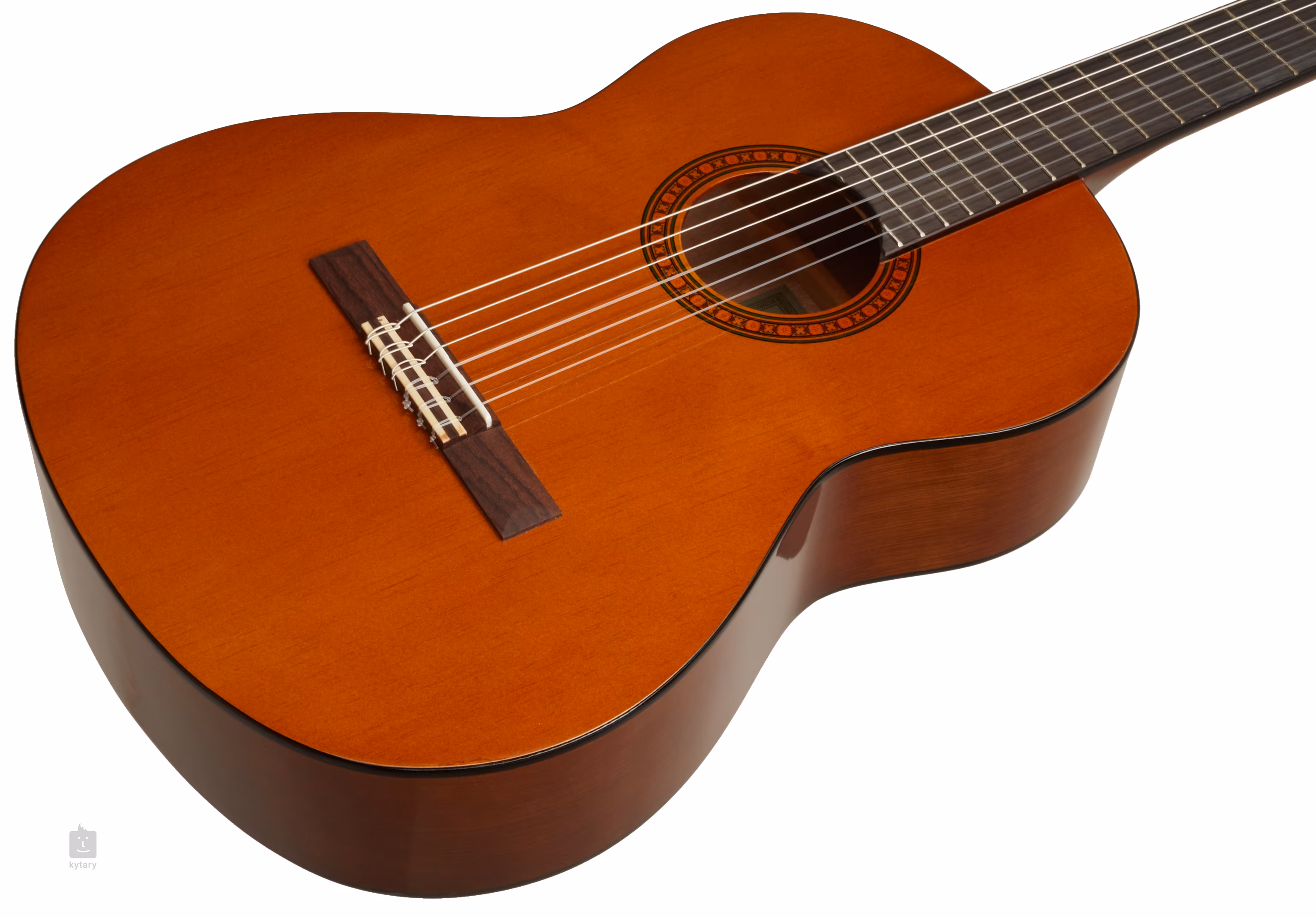 Die klassischen Gitarren der CS-Serie von Yamaha sind erschwingliche Instrumente in Dreiviertelgröße, die speziell für junge Schüler entwickelt wurden, die sie als angenehm zu spielen empfinden werden. Sie bietet solide Handwerkskunst mit einem Korpus aus Fichten-Sperrholz und einem Boden und Zargen aus Meranti-Sperrholz, einem Palisander-Griffbrett und einer Kopfplatte, klassischen offenen verchromten Mechaniken und traditionellen Verzierungen in Form von Bändern und Rosetten.